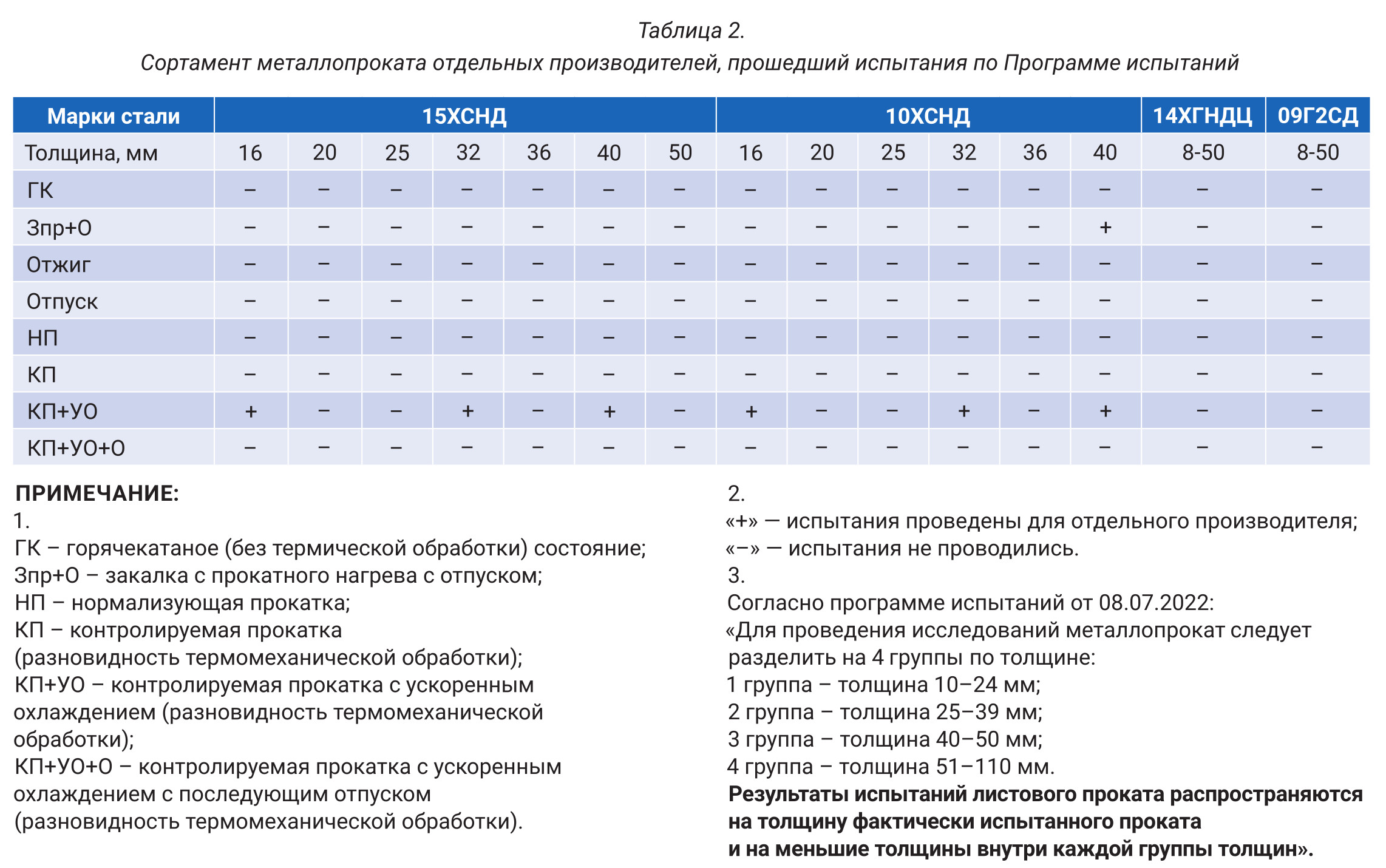 Для обоснования нововведений в ГОСТ 6713-2021 в авральном порядке, уже после его внедрения, была разработана заинтересованными сторонами, в том числе металлургами, и согласована Минтрансом и Минстроем России «Программа квалификационных испытаний…» от 08.07.2022 (далее — Программа). К сожалению, подходы, принятые при внедрении ГОСТ 6713-2021, перекочевали и в процесс исследований. Испытания мостового проката по Программе выполнены лишь в малой части размерного (в части толщин) и марочного сортамента ГОСТ 6713-2021 (подробная информация — в табл. 2), а именно — только для: